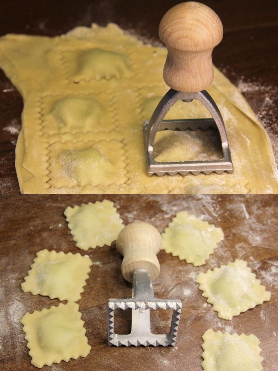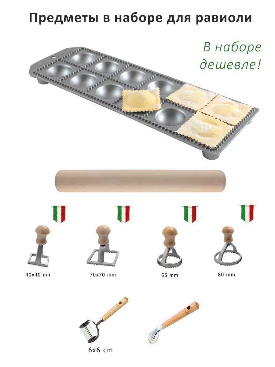 **Набор для изготовления равиоли (пельмени)** от итальянского производителя Eppicotispai. В наборе имеется алюминиевая формочка, 2 ножа для резки теста, 4 штампа и фирменная скалка. Поставляется в красивой упаковке с инструкцией, хороший подарок. Ручки у изделий деревянные - из крепкой породы бук. Смотрится набор стильно и не занимает много места на кухне. Алюминий пищевой - разрешенный к применению с пищевыми продуктами.