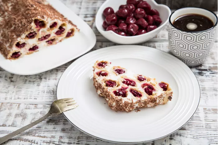 Пока тесто застывает, можно заняться вишневой начинкой. В классическом рецепте именно вишнями «фаршируются» «полена». При желании их можно заменить любой другой ягодой - малиной, голубикой, ежевикой, клюквой. Но именно вишне даст необходимую кислинку, которая сбалансирует жирность теста и сладость крема. К тому же вишня хороша в выпечке как в свежем виде, так и после заморозки.