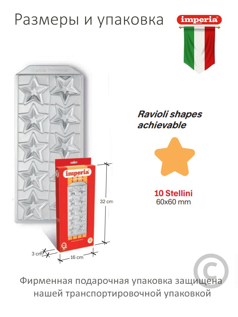 Форма для приготовления 10-и необычных равиоли в форме звёзочек Imperia Raviolamp 10 Stelline. Поставляется со скалкой с вращающимися ручками в комплекте.