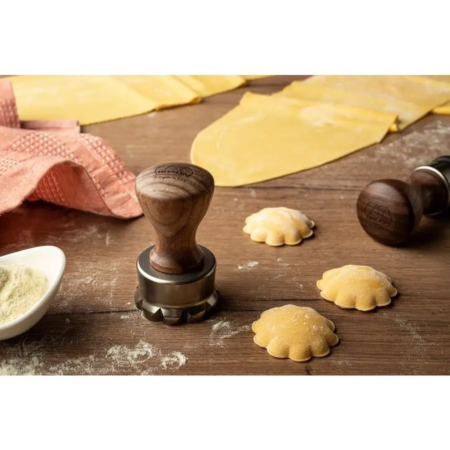 Штамп для равиоли в виде цветка диаметром 50мм. Изготовлено компанией Marcato непосредственно в Италии из материалов высшего качества. Этот штамп можно будет передать в наследство! Корпус штампа для равиоли изготовлен из латуни, чтобы гарантировать чистый срез теста. Механизм выталкивания с пружинным приводом из анодированного алюминия предназначен для равномерного прессования начинки и получения идеальной формы. Одним движением разрезает и отлично запечатывает тесто. Ручка штампа выполнены из массива дерева канадский грецкий орех, с отделкой натуральным воском и лазерной гравировкой. Она имеет эргономичную форму, что делает ручку стабильной и простой в использовании. Может использоваться для равиоли, печенья, пельменей. Металлическая форма для вареников и пельменей, пресс для теста на деревянной ручке. Товар показан на первом фото в карточке. В видео к товару демонстрируется, как сделать равиоли с помощью различных штампов этой уникальной серии.