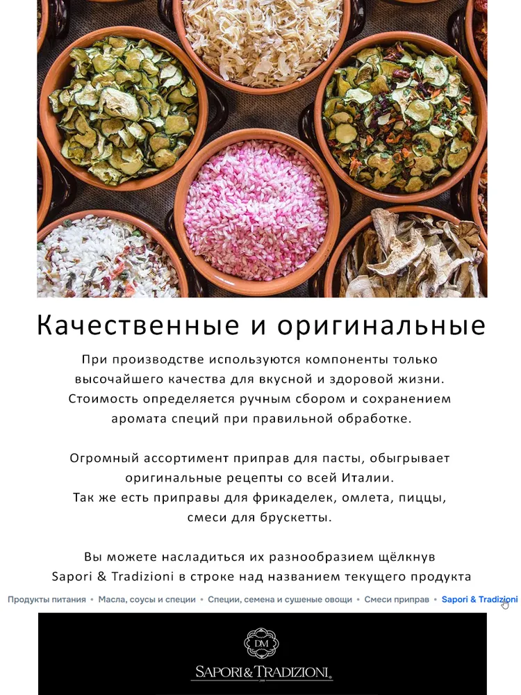 Огромный ассортимент приправ для пасты, обыгрывает оригинальные рецепты со всей Италии. Так же есть приправы для фрикаделек, омлета, пиццы, смеси для брускетты.