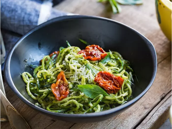 Второе правило – не ешьте лапшу с мясом, отдайте предпочтение овощам. Томаты с пастой – это классика. Шпинат, базилик, пассированный чеснок, черемша идеально сочетаются с любыми макаронными изделиями. Нашинкованные тонкой соломкой цукини и кабачки превращаются в овощные спагетти и прекрасно гармонируют с пастой, уменьшая ее калорийность до минимума.