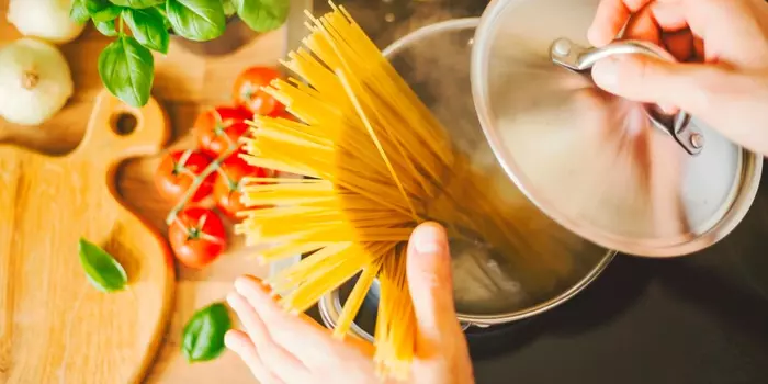Солить воду нужно до того, как она закипит. Соль, брошенная в кипяток, вызовет активное бурление и половина жидкости моментально окажется на поите. Вместе с солью в кастрюлю можно бросить лавровый лист или другую любимую пряность. Но совсем немного. Это придаст будущей пасте пикантную нотку.
