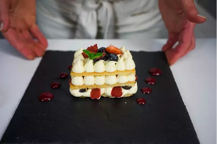 Мильфей принято считать французским десертом. Хотя вопрос довольно спорный. Первые упоминания о нем датируются 17-18 веком. В переводе с французского «mille-feuille» — тысяча слоев. Произносится название десерта на французский манер с ударением на второй слог и с мягкой «ё» — мильфЁй. Представляет собой это изысканное лакомство коржи хрустящего слоеного теста, щедро сдобренные кремом и усыпанные ягодами, которые призваны уравновесить вкус.