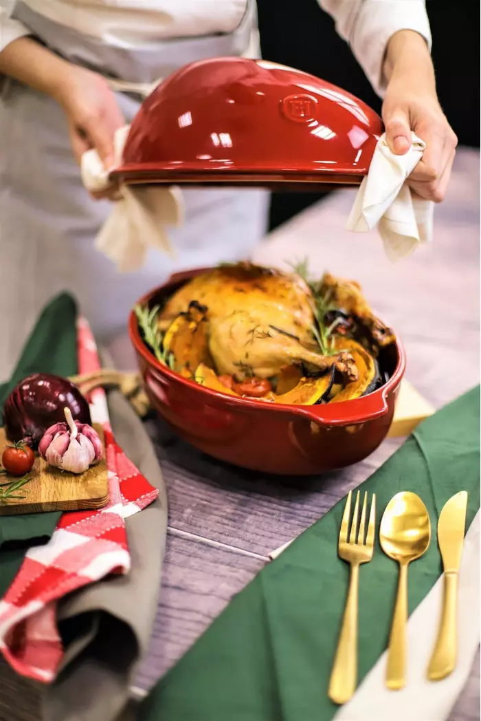 Поместите курицу в форму для запекания (жаровню), а затем добавьте другие ингредиенты, такие как тыква, помидоры, лук, розмарин и чеснок, пока не заполнится вся жаровня.