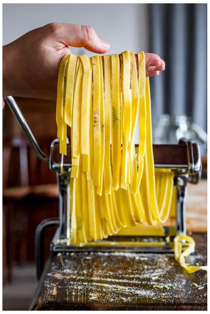 Я всегда готовила свежую пасту по рецепту моей бабушки – одно яйцо и 100 г муки, но в этот раз я хотела, чтобы макароны были ярко-желтыми, ярким знаком весны, поэтому я использовала 2 яйца и дополнительно 2 желтка на 300 г муки.