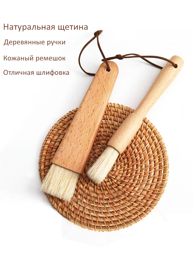 Комплект из двух кистей с натуральной щетиной с ручками из дерева и прекрасной шлифовкой украсит вашу кухню. Материал ручек сделан из крепкой древесины - бука.